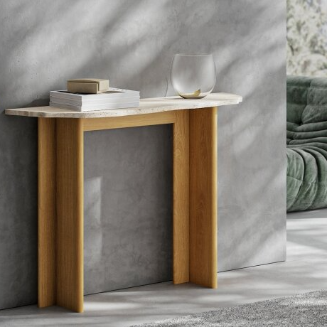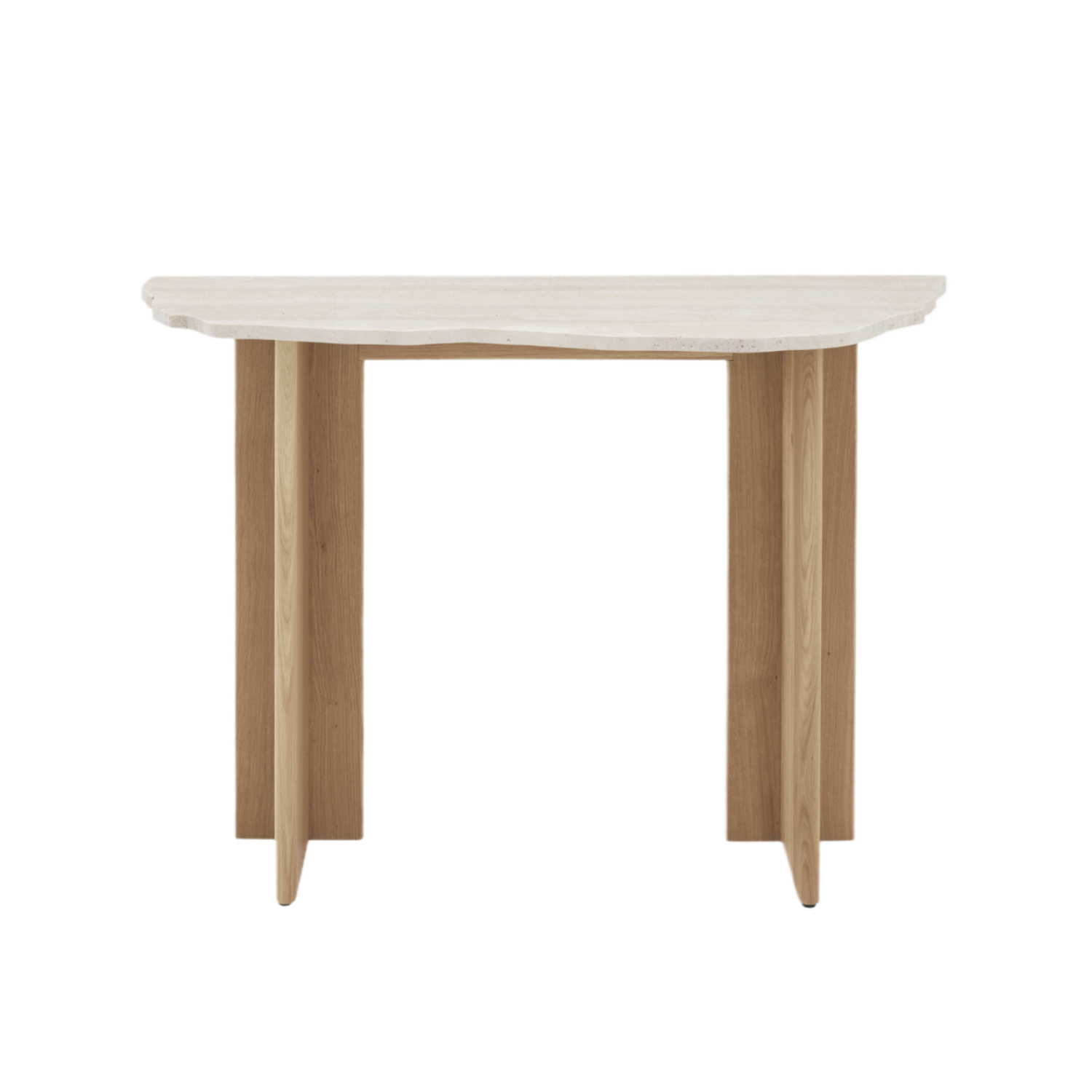 The Rhéa console table offers a poetic vision inspired by plants and nature. The structure of the legs is made of natural varnished oak whilst the top is in open pore travertine, with 2 layers of a waterproofing agent. The travertine top (limestone rock) has small cavities and has a raw unpolished edge enabling to feel a grained and irregular texture to the touch. Its colour reflects light. Travertine is worked and re-cut to form the shape of a leaf.