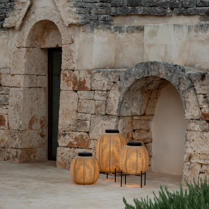 A solar-powered lantern which is bound to let your outdoor area glow. The camel coloured woven basket creates a stunning shadow. Also available in a larger version as well as in a black finish. You also have the option of adding a teak or black steel base.